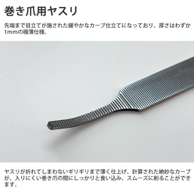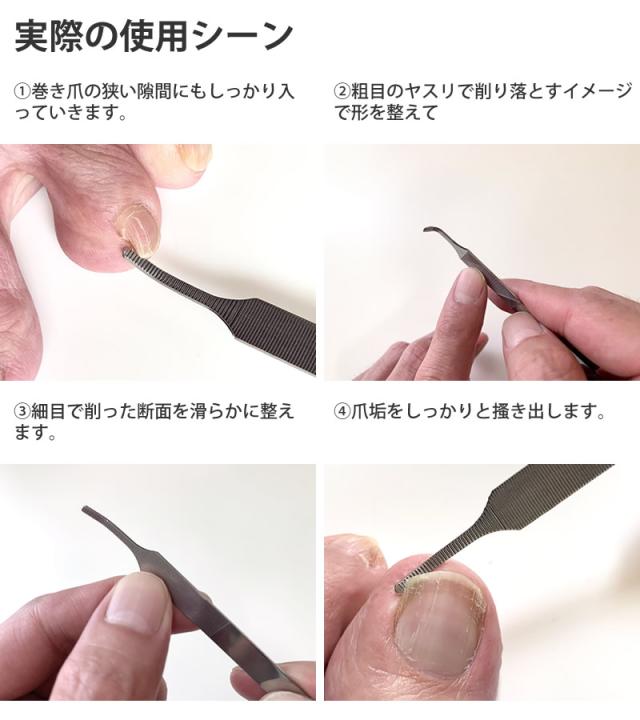 「巻き爪用ヤスリ」「通常仕上げ用ヤスリ」「爪垢取り」3つの機能を一つのヤスリに搭載!