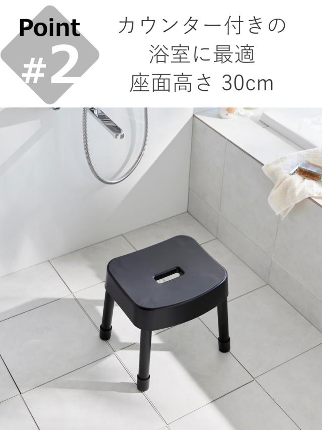 シンプルでスタイリッシュなデザインで、お風呂場のどこに置いても馴染みます。座面の高さはカウンター付きの浴室に最適な30cmです。