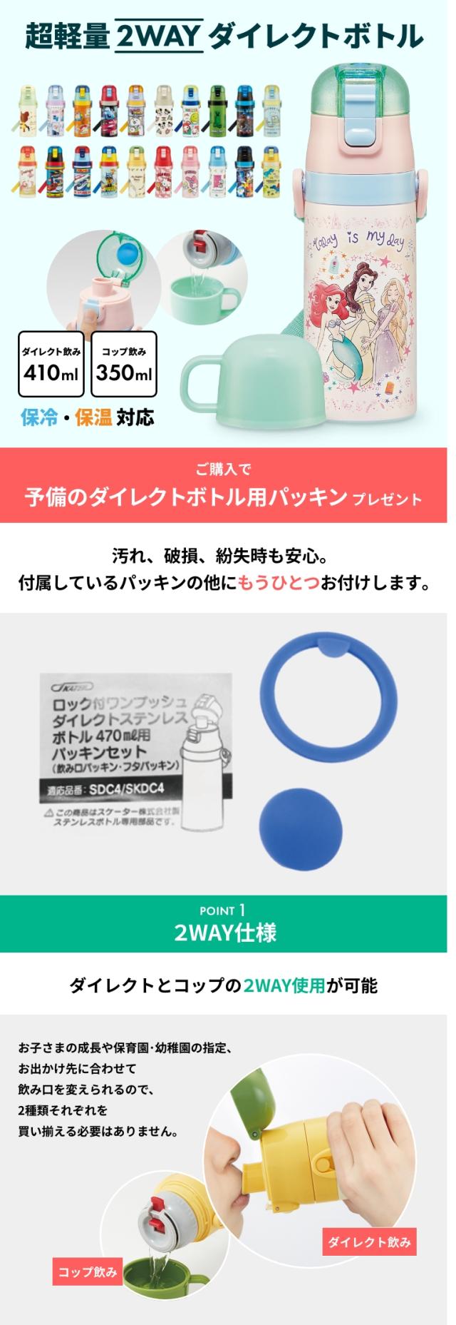 水筒 直飲み 予備パッキン 超軽量2WAYダイレクトボトル 直飲み410ml コップ350ml SKDC3+替えパッキンセット P-SDC4-PS スケーター 全20種類 ステンレスボトル キッズ 超軽量 キャラクター 軽い コップ付き 新生活 入園 入学 子供 送料無料