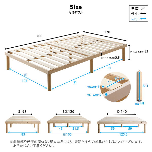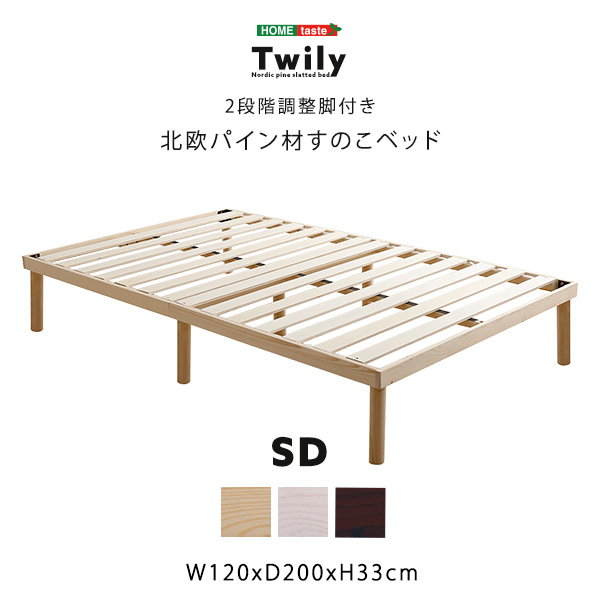 すのこベッド ベッドフレーム セミダブル 北欧パイン材 2段階調整脚付き 木製 天然木 耐荷重200kg 低ホルムアルデヒド