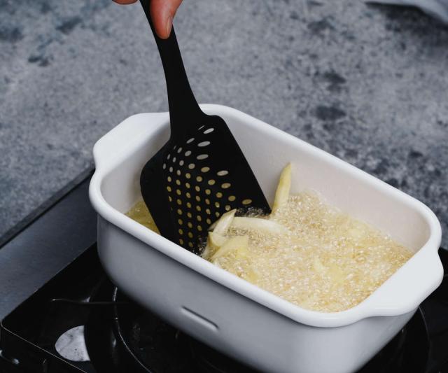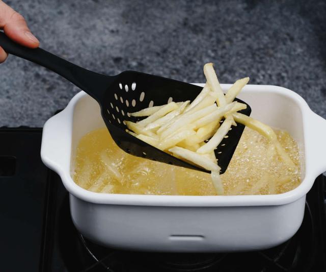 揚げ物の油切りや、茹で野菜の湯切りなどに便利なスコップストレーナーです。大きな具材や、ポテトフライも深めの大容量のスコップ部分でしっかりすくうことができます。わざわざザルを出さなくても鍋の上でサッと野菜の湯切りができます。