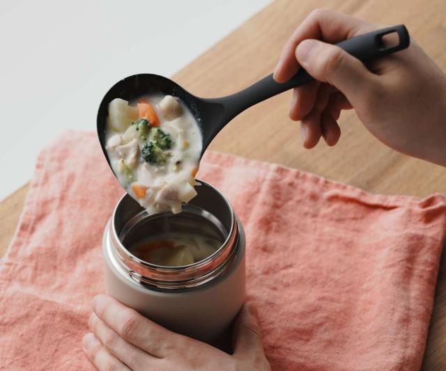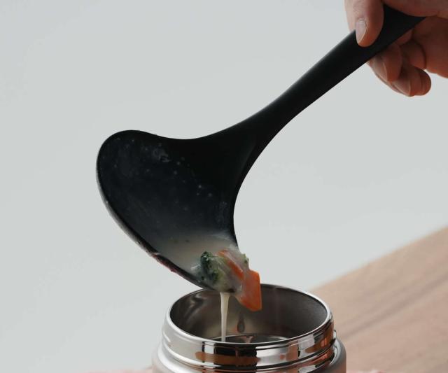お弁当用に温かいスープを持ち運べるスープジャーにちょうどいいミニサイズの横口レードルです。細い口径でもこぼさずにきれいに注ぐことができます。
