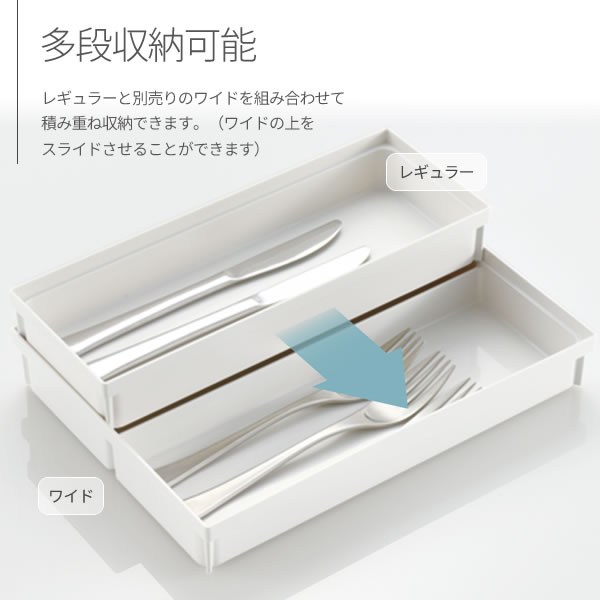 スタッキングで省スペース収納別売りの「カトラリーポケットN ワイド」の上にスタッキングできます。たくさんあるカトラリー類を、省スペースで一括収納!