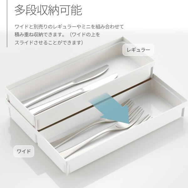 スタッキングで省スペース収納別売りの「カトラリーポケットN ミニ」や「カトラリーポケットN レギュラー」を上に重ねてスタッキングできます。たくさんあるカトラリー類を、省スペースで一括収納!