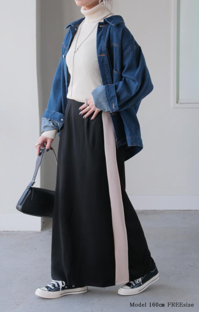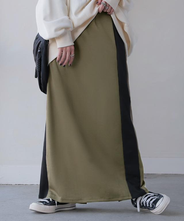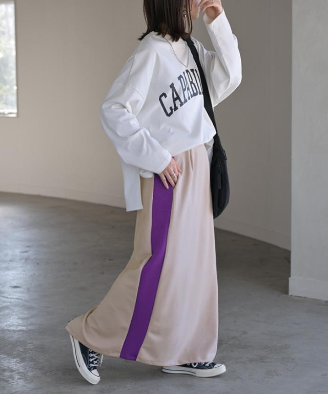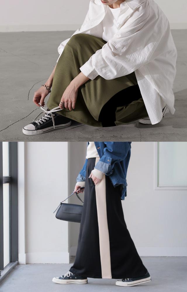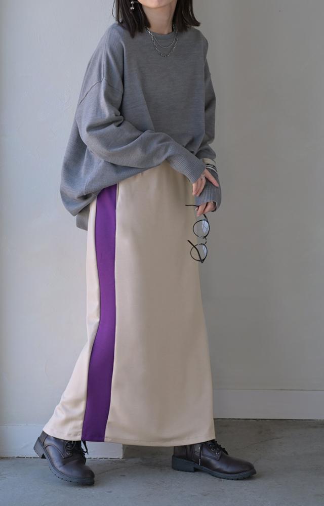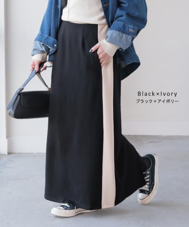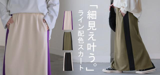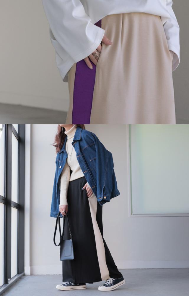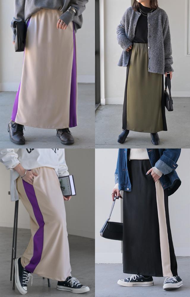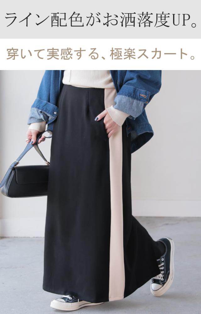 存在たっぷりな配色ラインで大人っぽいこなれ感あるナロースカートです。