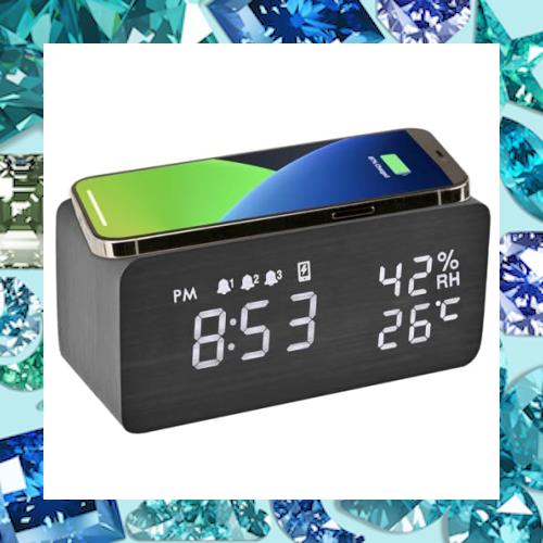 Electime 目覚まし時計 置き時計 スマホ充電機能 デジタル 多機能 木目 卓上時計 Qiワイヤレス充電器 スヌーズ 温度/湿度/アラーム 自動