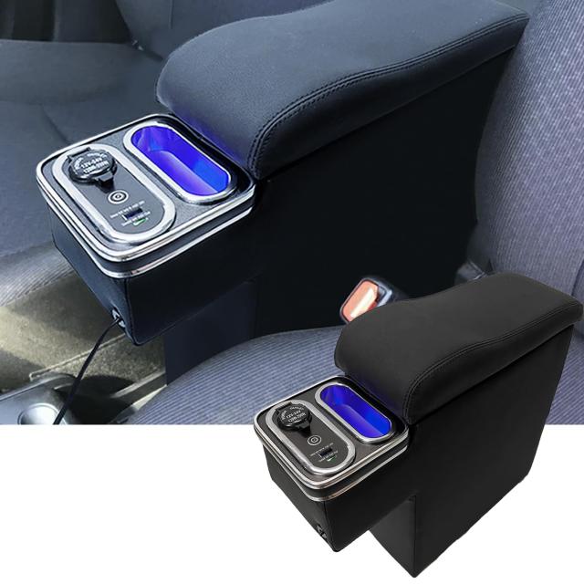 【最新型コンソールボックス】:コンソールボックスはブルーLEDライトが付属し、シガーソケットから給電しスイッチを押すと、ライトが点灯します、夜間でも明るく車内を照らします。車内のライト点けずに、運転中の視界の安全を確保します。シガーソケットが1ポート、USBポート1個、スマホホルダー1個を搭載しています。