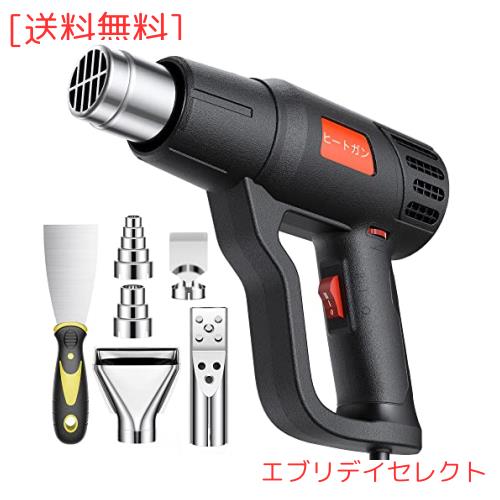 【6種アクセサリー付きホットガン ヒートガン】 ●強力熱風で各種熱処理加工に使える多用途ホットガン。ノズル5種類が付いて、熱収縮チューブの収縮、接着剤処理、パテの剥離、樹脂管成型、プラスチック溶接、熱収縮フィルムの加熱、シール剥がし、基板の修理、溶接、乾燥、解凍など多用途に使えます。●ノズル以外に、スクレーパーも付属しています。ホットガンを使って加工しやすくした物を、削ったり剥がしたりする作業にご使用できます。豊富なアクセサリーでとても使いやすいホットガン ヒートガンです。