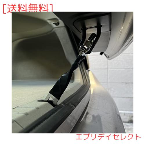 【取り付け簡単】2個入り車内換気用ドアストッパーはドアを開けた状態で、フックを車体側のストライカーに引っ掛け、逆側をリアゲートのキャッチに押し込んでロックします。取り外す際には逆の手順でリアゲート側から外れます。このドアストッパーが取り付けた状態で鍵ロックができ、楽ですね。