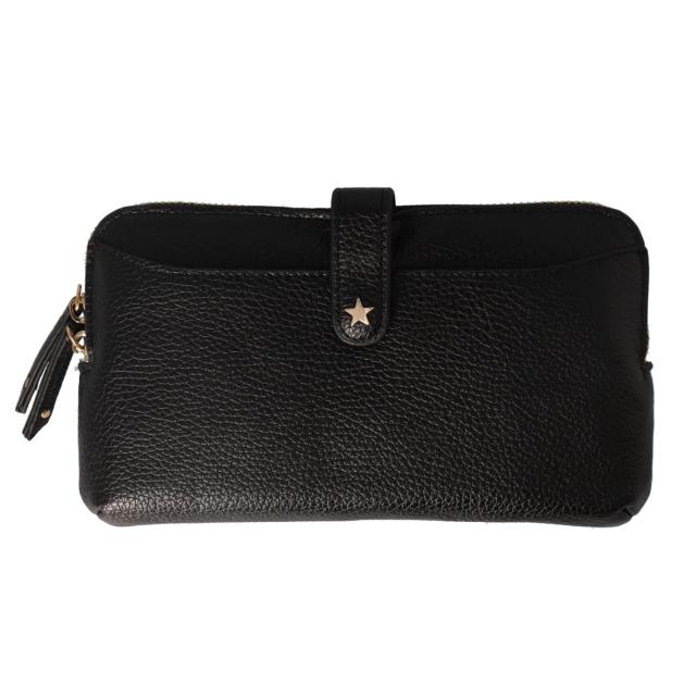 星形のモチーフがポイント♪「Pisoraro(ピソラロ)」からスターシュリンク 横型スマホポシェットが発売♪【様々なコーデに対応】表面にシボ感のあるフェイクレザー素材を使用し、星形モチーフ付きの留め具がアクセント。カジュアル過ぎず、キレイめコーデにも素敵にマッチ◎【ミニマル女子におススメ♪】お出かけ時にサッと持ち出して、身軽にGO!必要最低限の小物がすっきりまとまり、ちょっとそこまでのお出かけやお買い物、旅行などに便利。【持ち方を選べる2way仕様】長いストラップを付けてポシェット、ストラップを取り外せば、クラッチバッグとして活躍。お好みやシーンに合わせてスタイルチェンジ☆【たっぷり収納できる3ルーム構造】内側は3つのルームに分かれており、仕分けしやすく取り出しやすいつくり。多数のポケットを装備し、現金やカード類に加えてスマホやリップ、パスポートなども収納可能。【鍵が迷子にならない】キーフック付きで迷子になりがちな鍵の定位置に。シーンに合わせて付け外しができるのもポイント。【取り出しに便利なアウトポケット】フロントと背面にスマホやパスケース等サッと取り出したい小物の定位置に便利なアウトポケット付き。背面のアウトポケットにカードポケット付き。【ポケット仕様】メインルーム・・・仕切りファスナーポケット×1、カードポケット8、ファスナーポケット×1フロント・・・オープンポケット×1(星形モチーフの留め具付き)背面・・・オープンポケット×1(内側カードポケット付き)