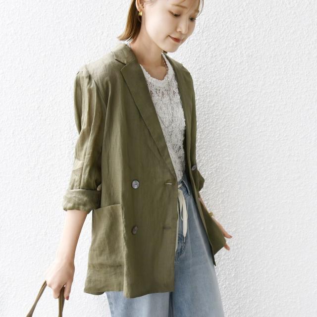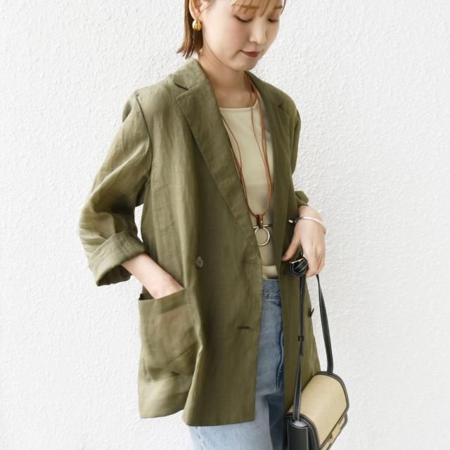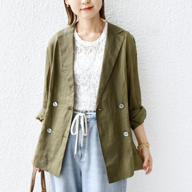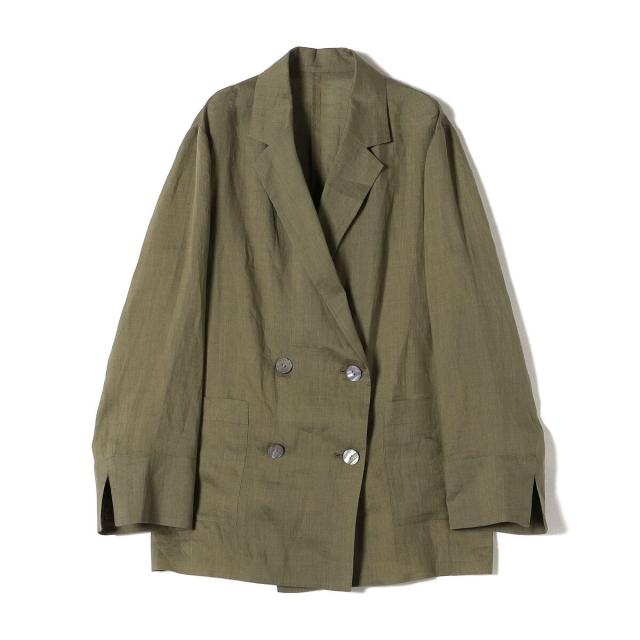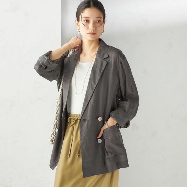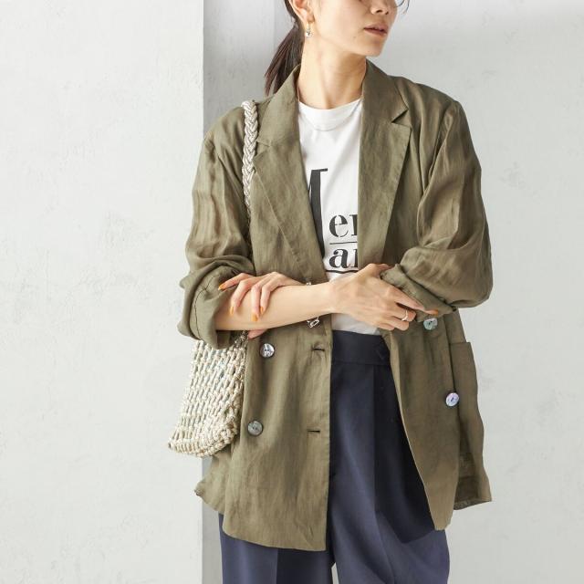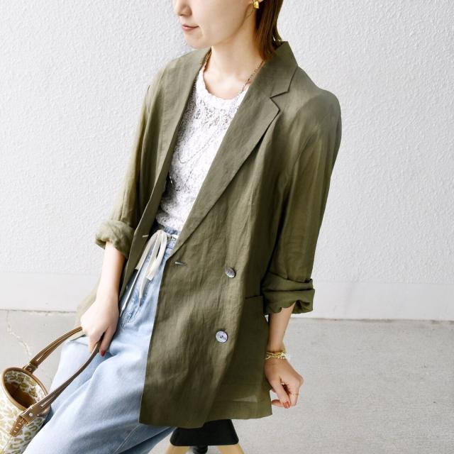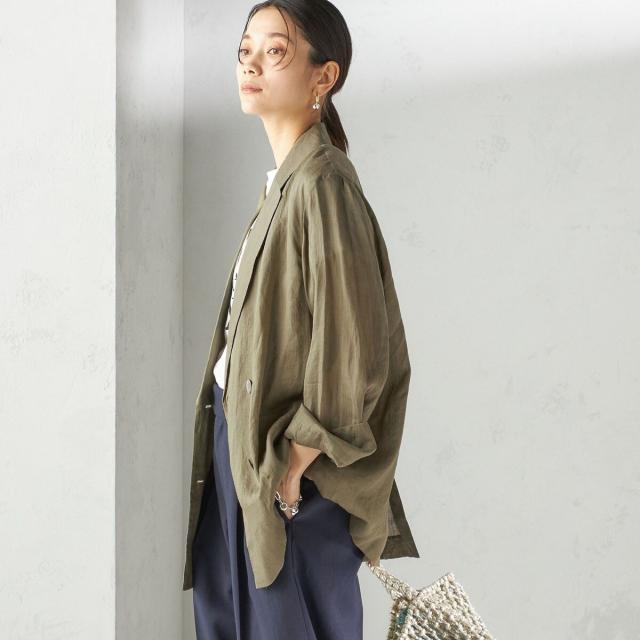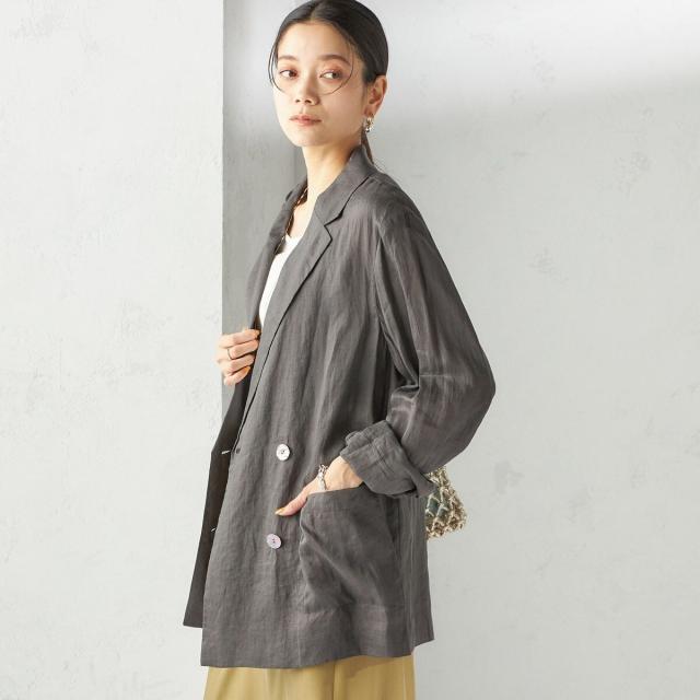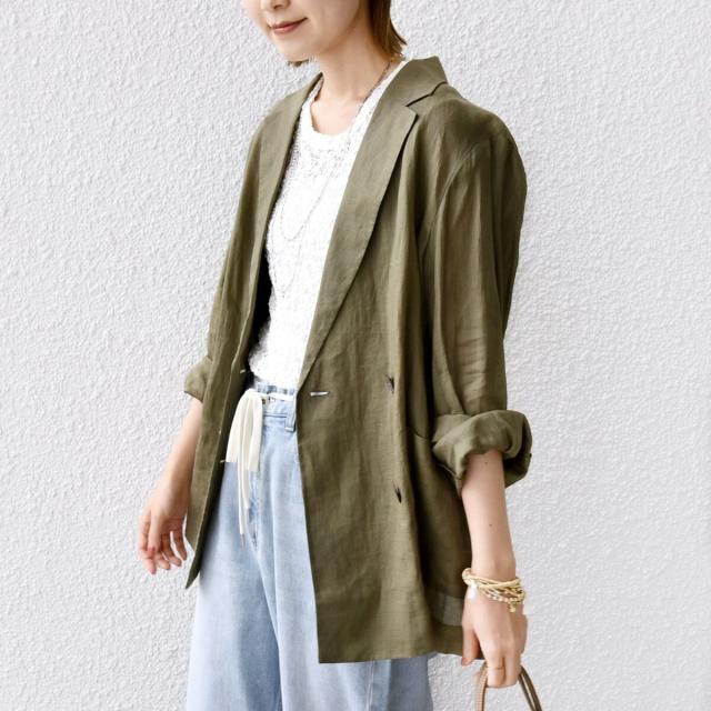 テーラードのダブルブレストのシンプルな形で、ゆったりとした身頃感がポイントの羽織ジャケットです。