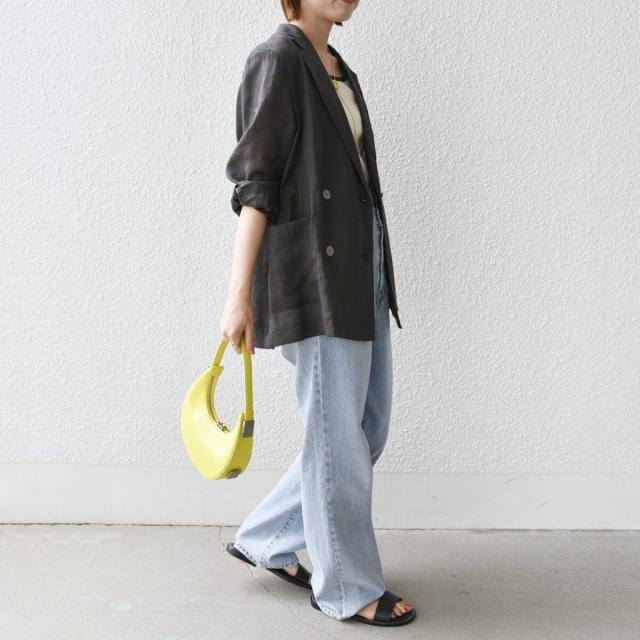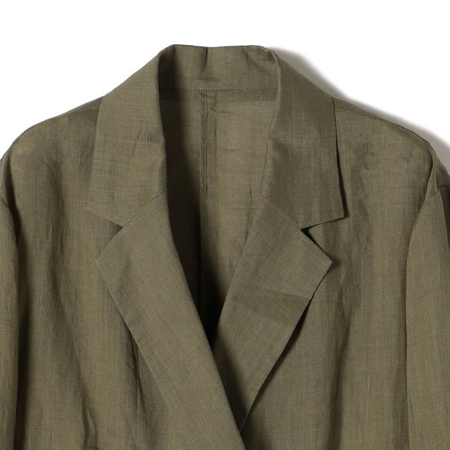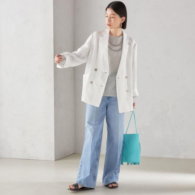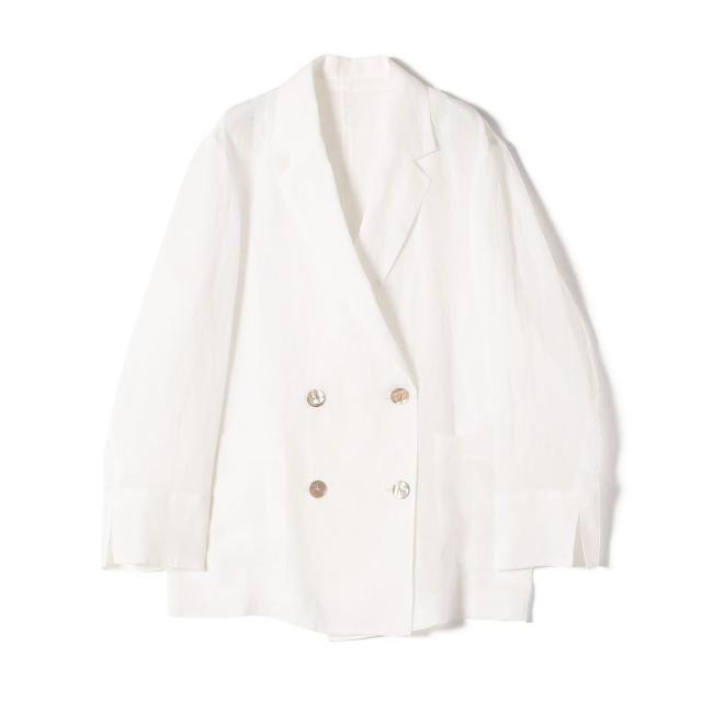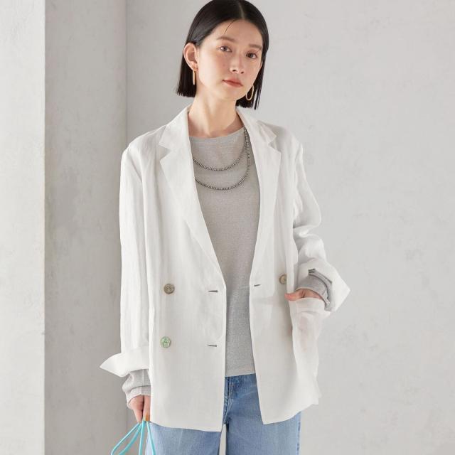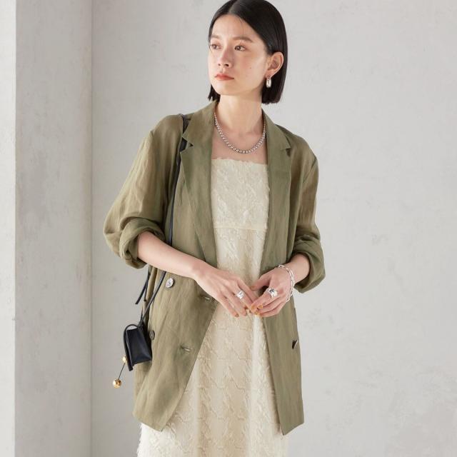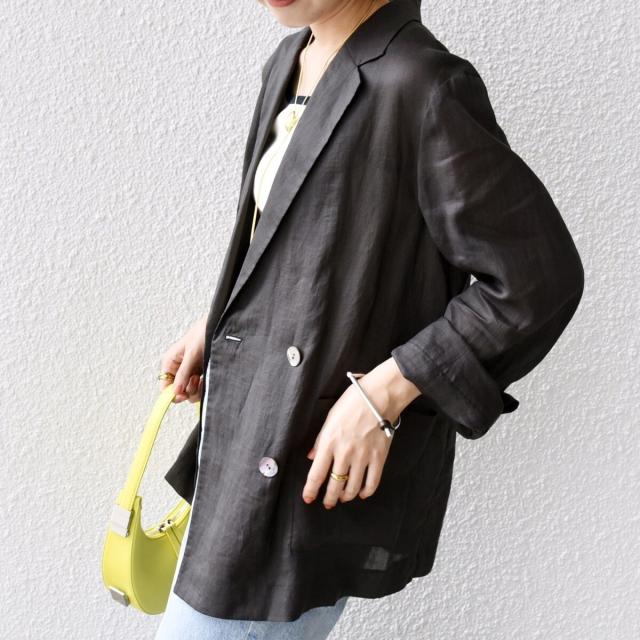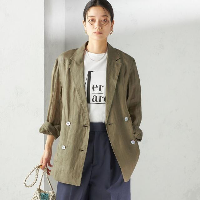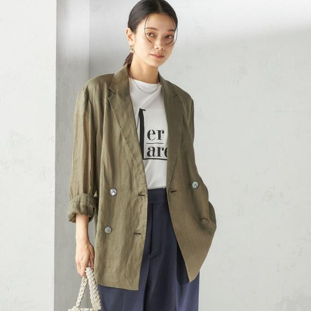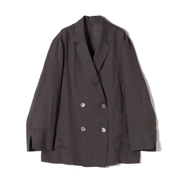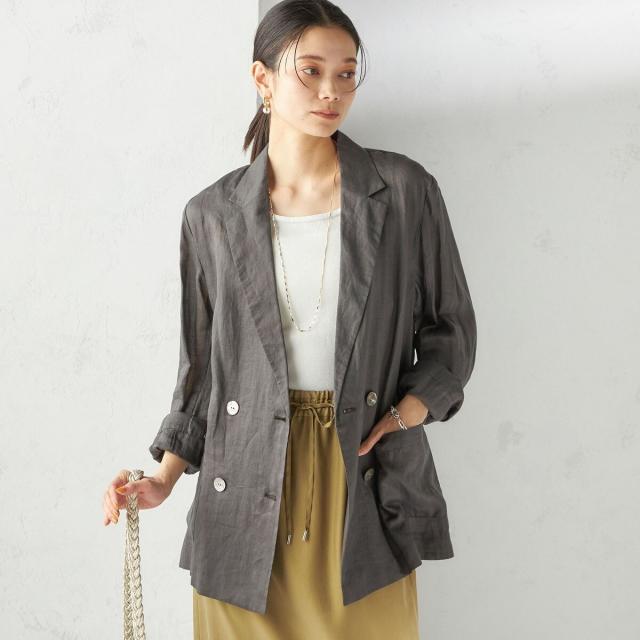 テーラードのダブルブレストのシンプルな形で、ゆったりとした身頃感がポイントの羽織ジャケットです。