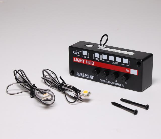 調光可能なライトポートを4つ備えるライトハブとストラクチャーの照明に好適のシーリングライトを2個付属 別売の電源アダプターまたは9V電池用のバッテリーケースを組み合わせることでレイアウトやジオラマへの照明の導入が可能