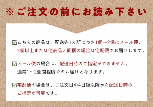 ※配送先1カ所につき、1〜2個のご注文はメール便、3個以上のご注文は宅配便にてお届けします。