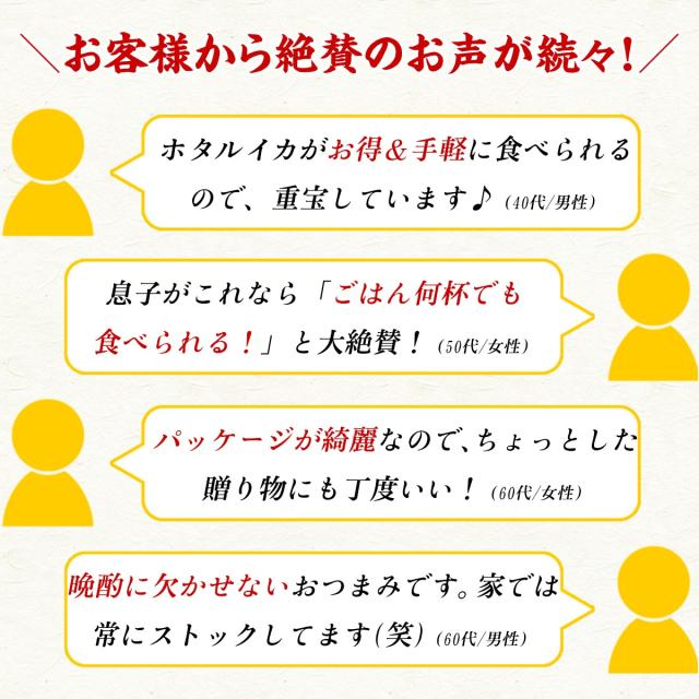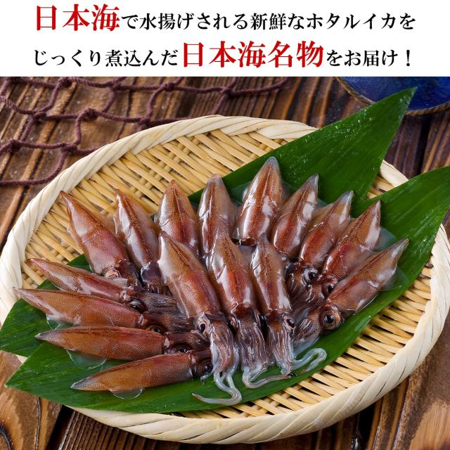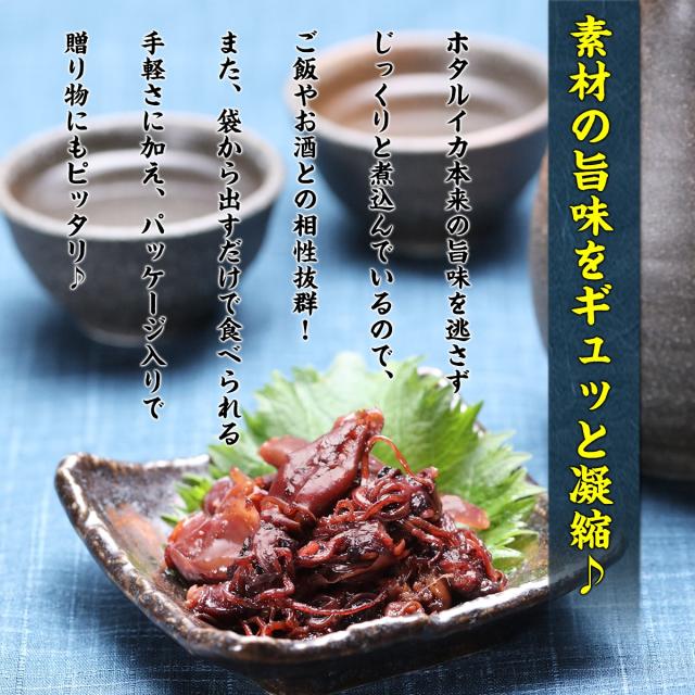 原材料:ほたるいか(国産)、還元水あめ、砂糖、醤油(小麦・大豆を含む)、みりん、水あめ、食塩/調味料(アミノ酸等)
