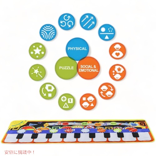 テンコズ ミュージカル ピアノマット Tencoz、キーボード 鍵盤 プレーマットサイズ:38.8x24.9x4.8 (パッケージサイズ)19の鍵盤を足で踏んでメロディーを奏でよう!!8種類ある楽器(ピアノ、オーボエ、バイオリン、アコーディオン、トランペット、フルート、ビブラフォン、ギター)から好きな音を選ぶことができます。お子様は手と足で同時にピアノを演奏して、ビートに合わせて楽しく音楽を作成できます。このミュージカルピアノマットは、柔らかく、無味無毒の不織布です。高品質の生地は子供の足を傷つけず、お手入れも簡単です。 マットは折りたたみ式で持ち運びが簡単でコンパクトに収納でき、屋外でも屋内でもお楽しみいただけます。キーボードマットのサイズ(約)、110x36センチ1.5Vの単3形電池3つ必要。(電池は含まれません) ご使用が2分以上ないと、自動的に節電モードに切り替わります。3歳以上のすべてのお子様にお楽しみいただけます。お誕生日やクリスマスのプレゼントにどうぞ。お手入れの際は、柔らかな布で拭いてください。本商品