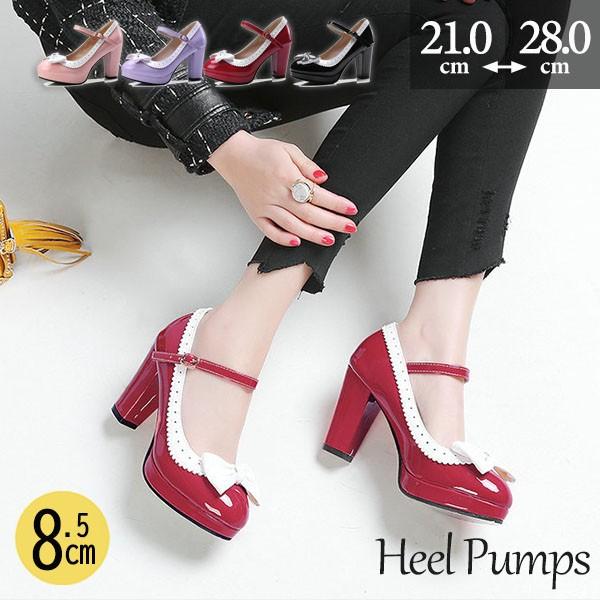 ヒールパンプス レディース ストラップ メリージェーン 春秋 エナメル つや有り 合成皮革靴 ヒール8.5センチ リボン 太い ヒール ラウンドトゥ パーティー靴 大きいサイズ 小さいサイズ 大人 パーティーシューズ 結婚式 謝恩会 美脚 脚長効果 黒 ブラック di163x1x1zu