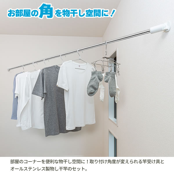 お部屋のデッドスペースを便利な物干し空間に!角度調節できる竿受けとオールステンレス物干し竿のセット。