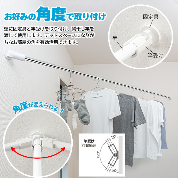 竿受けの角度調節可能。デッドスペースになりがちなお部屋の角を有効活用できます。