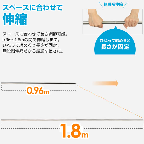 96cm〜180cmの範囲で伸縮するので、設置場所に合わせて長さ調節が可能です。
