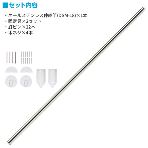 セット内容オールステンレス伸縮竿×1本、固定具×2セット、釘ピン×12本、木ネジ×4本