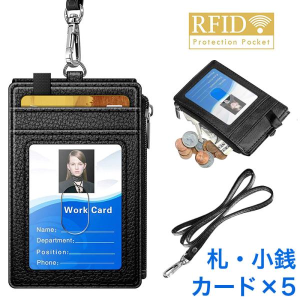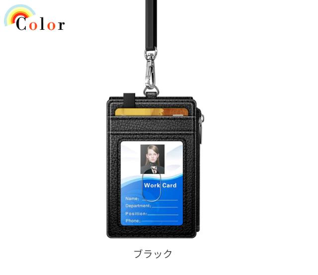 IDカードホルダー IDケース 縦型 レザー 本革調 ネックストラップ付き 小銭入れ 鍵入れ スキミング防止 カードケース 5枚 収納 メンズ レディース 社員証 記念品