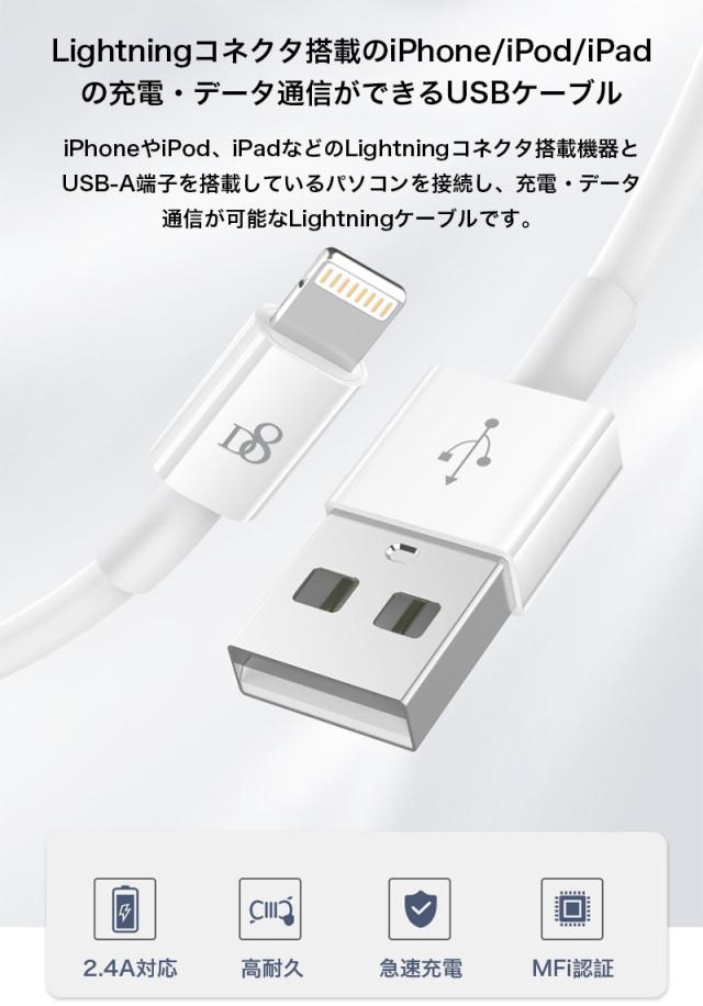 Lightning ケーブル ライトニングケーブル iPhone iPad iPod 充電ケーブル USBケーブル 長さ1.5m アップル社認証 MFi認証 2.4A 急速充電 断線しにくい