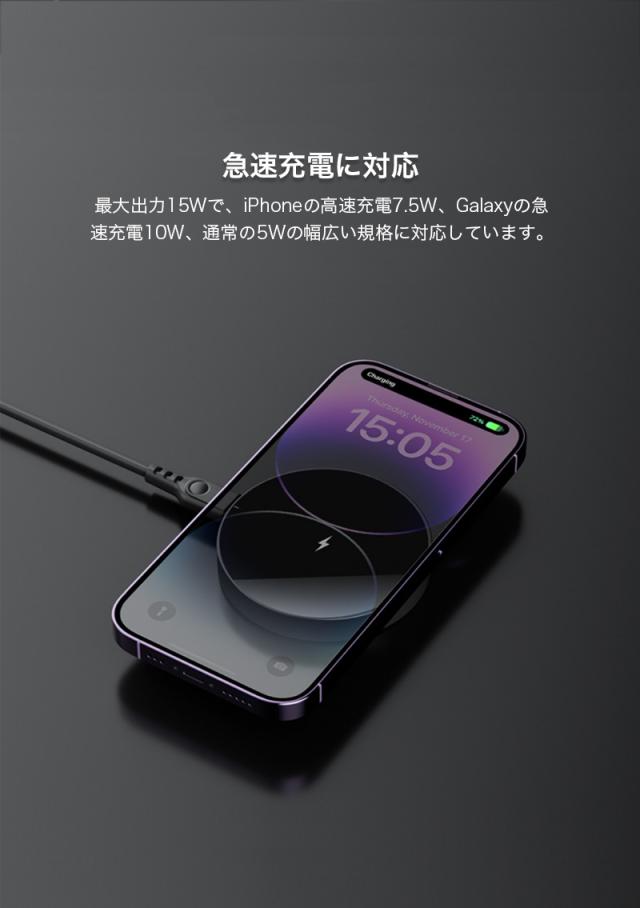 ワイヤレス充電器 おくだけで充電 15W 急速充電対応 温度検知機能付き 安全安心 iPhone Galaxy Xperia Pixcel 8 8 9 9 proxl 7 7a 8a 9a 7pro アイホン ギャラクシー エクスペリア 充電完了 自動停止 高温防止 USB電源式 Qi規格対応 おしゃれ 滑り止め スリム コンパクト 薄型タイプ 便利 AirPods