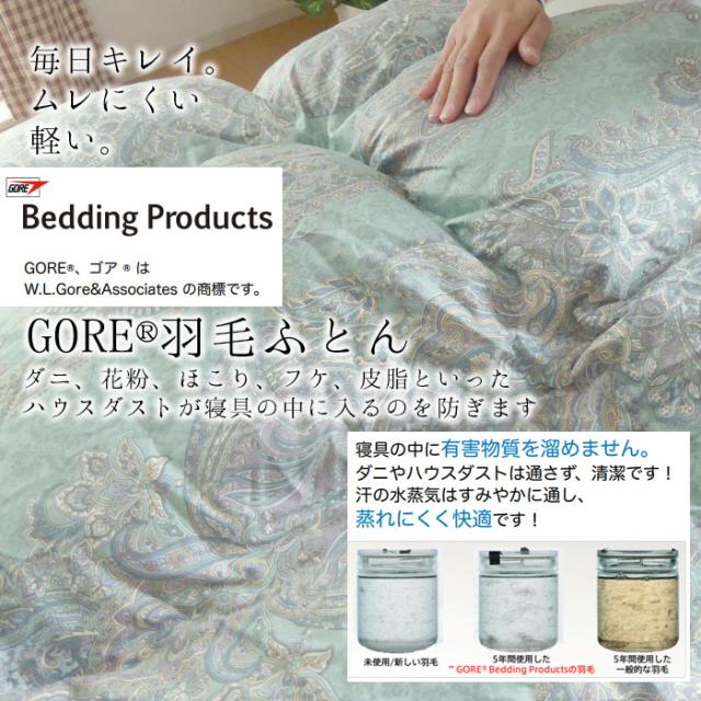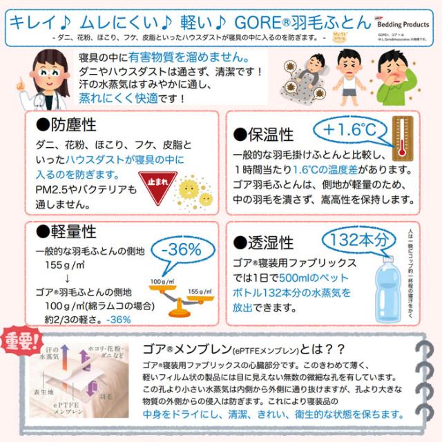ゴア羽毛ふとんは、側地が軽量のため、中の羽毛を潰さず、嵩高性を保持します。
