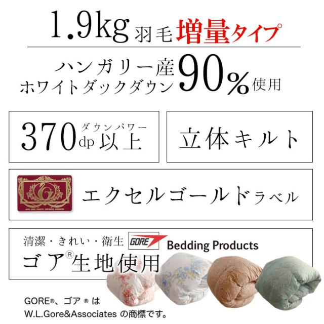 増量1.9kg ゴア羽毛布団 クイーンロング 210×210 クィーン 日本製 エクセルゴールドラベル 立体キルト ハンガリー産 ホワイトダックダウン90% あったかい あったか ダニ対策 ほこり対策 軽量性 防塵性 保温性 透湿性に優れた 羽毛ぶとん インスーラK シアードHDK