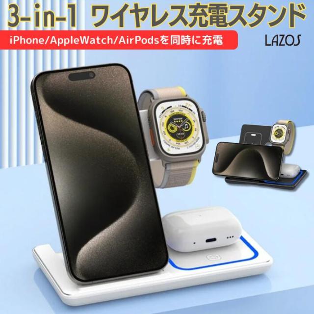 ワイヤレス充電器 iPhone15 iPhone14 iPhone13 ワイヤレス 充電器 折り畳み式 3in1 15w急速 ワイヤレスチャージャー 充電スタンド Qi急速充電 3台 同時充電 横置き 縦置き スタンド充電 AirPodsPro AppleWatch 9 8 7 6 5 SE iPhone12 12Pro おしゃれ 便利