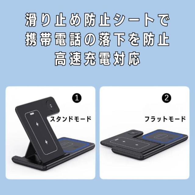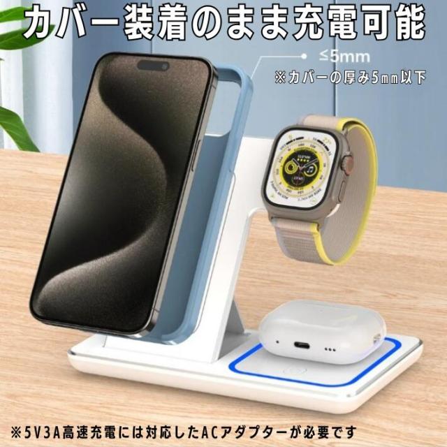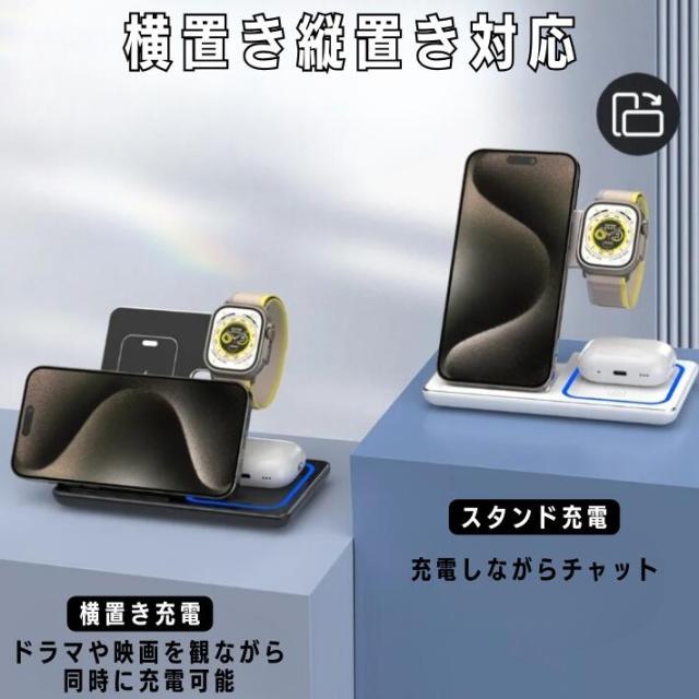 ワイヤレス充電器 iPhone15 iPhone14 iPhone13 ワイヤレス 充電器 折り畳み式 3in1 15w急速 ワイヤレスチャージャー 充電スタンド Qi急速充電 3台 同時充電 横置き 縦置き スタンド充電 AirPodsPro AppleWatch 9 8 7 6 5 SE iPhone12 12Pro おしゃれ 便利【商品説明】