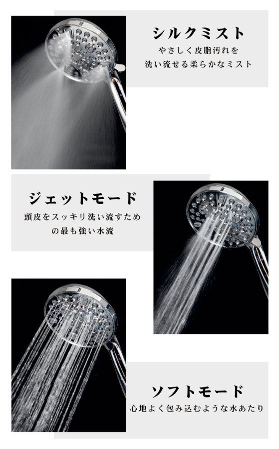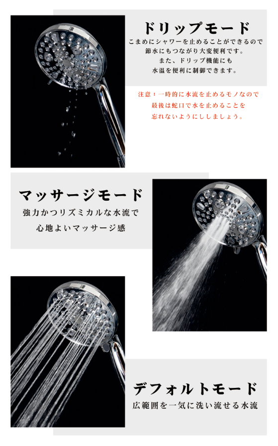 - 取り付けも簡単で、色々な水流が味わえます。節水効果もバッチリです。