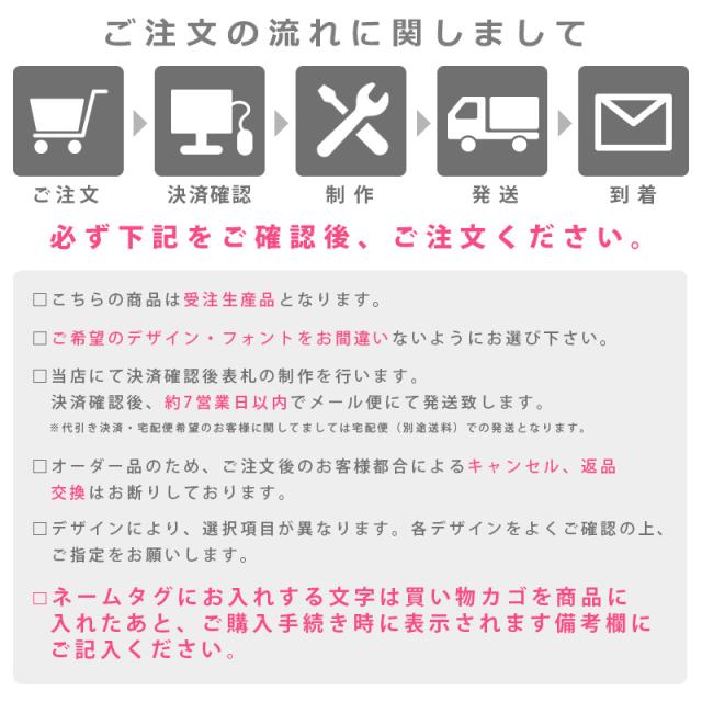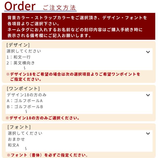 | ご注文に関しまして | ・ネームタグにお入れする文字(名前など)はご購入手続き時の備考欄にご入力お願いします。デザイン1〜23の場合は和文・英文両方の入力をお願いします。 |