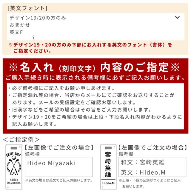 ・デザイン19・20の方のみ和文・英文の2ヶ所刻印となりますのでフォント2より英文フォントをお選びください。