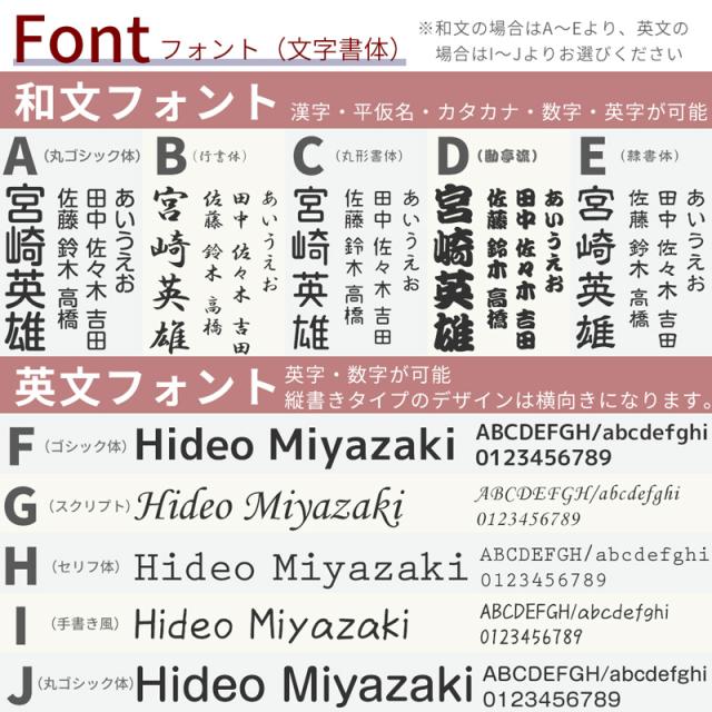 ・縦書きタイプのデザインで英文フォントをお選び頂いた場合、「デザイン2英文横向き」のように横向き表記での刻印となります。