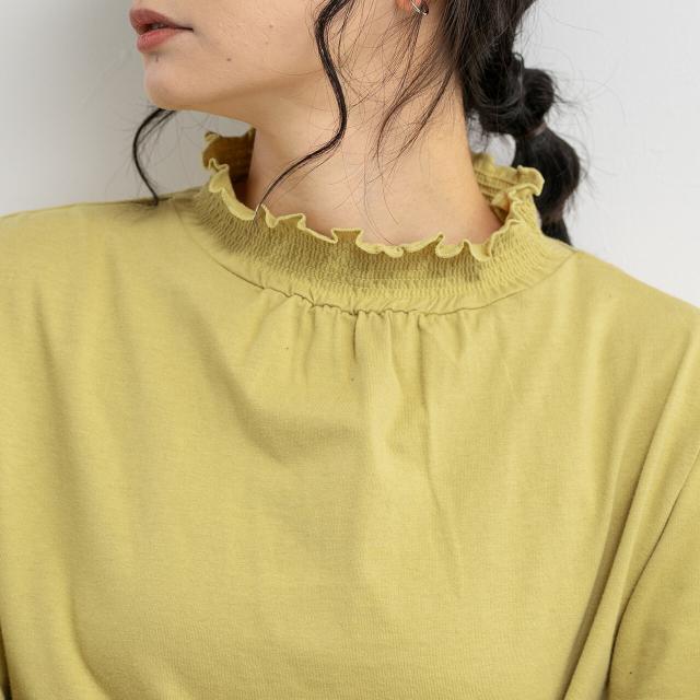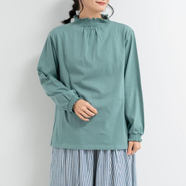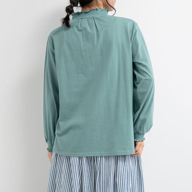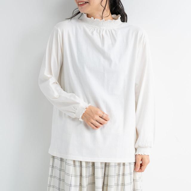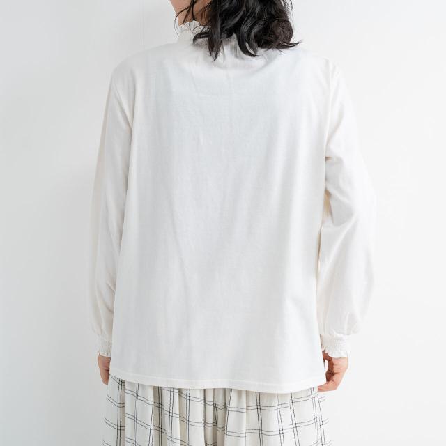 襟まわりと袖口をシャーリングにすることで繊細さと甘さをプラスしてくれます。