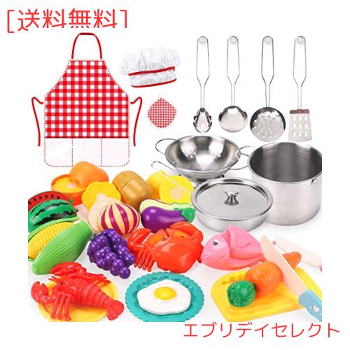 Qizebaby おもちゃ キッチンおもちゃセット おままごと子供のゲーム ステンレス鋼の調理器具の鍋とフライパンのセット、調理器具、エプロ