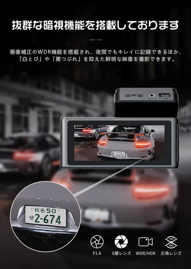 ● 【WDRワイドダイナミック画像処理】日中の運転中の強い日光や影の下でも、WDRは高輝度シーンを効果的にフィルタリングして処理し、ビデオがリアルで詳細なままとなり、それによりビデオ情報を全面的に提供されます。 また、F/1.6の大絞りにより十分な光を取り込むことができ、夜間の暗い場所でもより明るく鮮明な録画が可能です。 夜間の運転時に高品質のビデオファイルを取得できるため、夜間運転の安全性と信頼性が向上します。