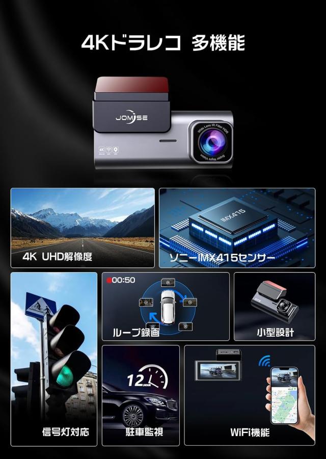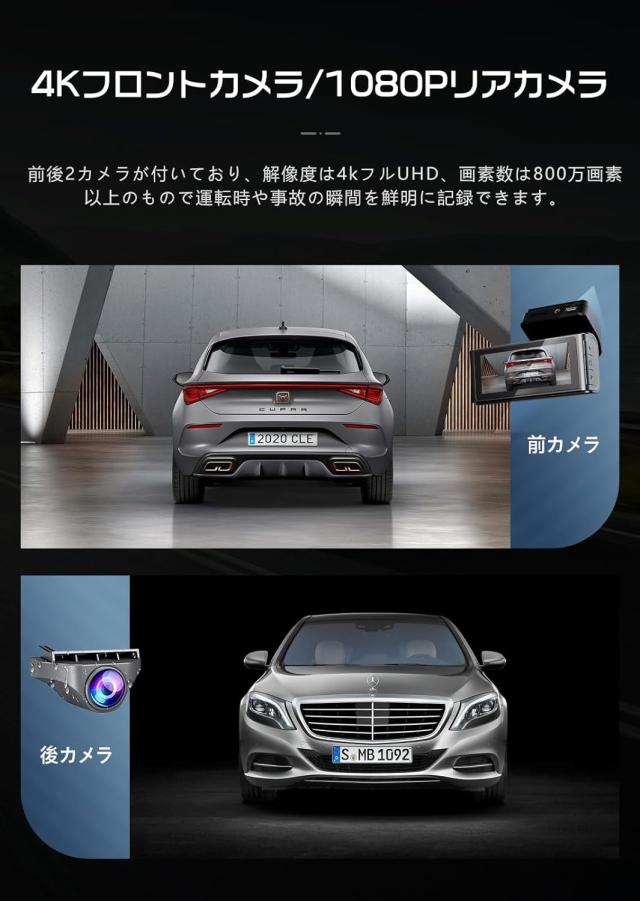 ドライブレコーダー 4K 前後2カメラ WiFi搭載 800万画素 ドラレコ 3.16インチタッチパネル 前170°+後150° 広角レンズ WDR/HDR機能 スーパー暗視機能 ループ録画 GPS内蔵 駐車監視 衝撃検知 Gセンサー 緊急録画 地デジ干渉対策 LED信号機対策