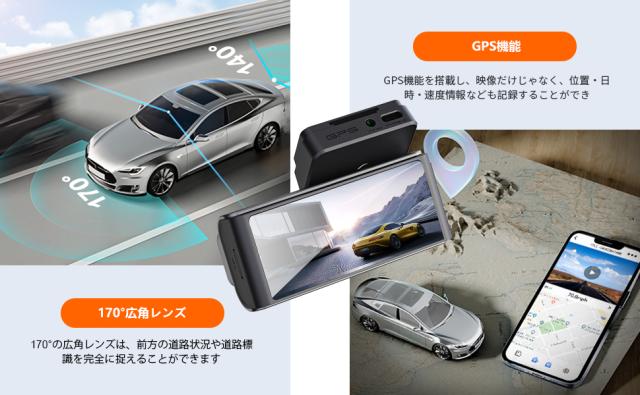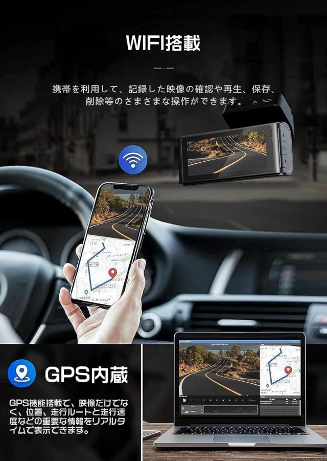 ● 【WIFI搭載& GPS内蔵】WIFI機能を内蔵することで、SDカードを取り出さずに動画や写真などのデータを簡単に見たり、ダウンロードしたり、共有できます。アプリでレコーダーのコンテンツ設定ができ、パソコンに接続しなくても動画ファイルを読み込むことができます。内蔵GPSモジュールで正確な速度、位置、ルートを記録されます。動画を再生することで、速度や位置情報、走行ルートを正確に見ることができ、事故の責任を問い、重要なデータを提供できます。