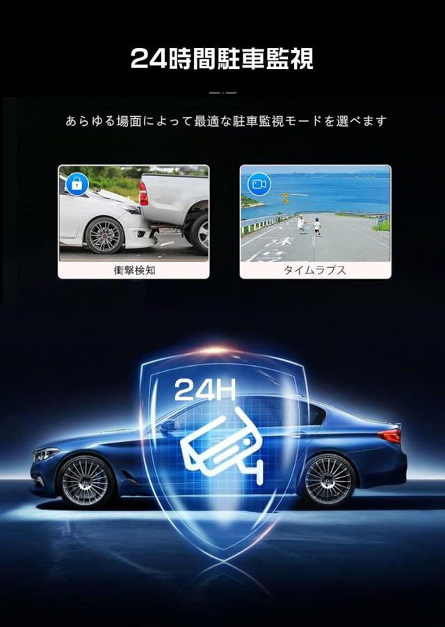 ● 【24時間駐車監視】 1 衝突検知による映像保護:駐車中に車の衝突や振動を検知すると、ドラレコ本体が自動的に起動して録画します。 消費電力を削減し、超長時間の駐車監視を実現します。 2 タイムラプス録画の長期保護: 1 秒あたりの静止画を短いビデオに圧縮して長期間の録画を実現します。 エンジンを切ると自動的に録画が開始され、24時間後に自動的に終了するように設定できます。 ご注意: この機能を使用するには、専用の降圧ケーブルを接続する必要があります。 降圧ケーブルは別途購入が必要ですが、必要な場合は無償でご提供いたしますのでご相談ください。