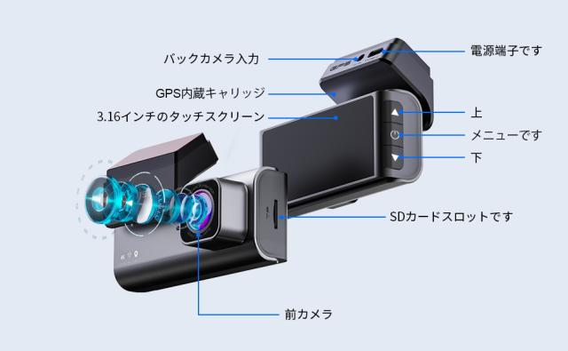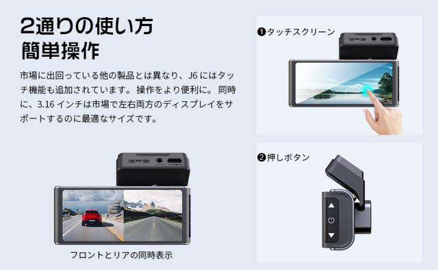 ● 【3インチ高精細タッチスクリーン+スーパーキャパシタ】 設定や動画視聴の操作もタッチパネルで簡単に完了できます。従来の機器は、ボタンによるメニュー設定や映像の確認、動作状況の確認などの操作を行うために、通常、取り外して使用する必要がありました。なお、 画面をタップするだけで、目的のインターフェイスにアクセスできます。 スーパーキャパシタを内蔵しているため、車内の高温による液漏れやバッテリーの膨張の心配がなく、寒冷地などの過酷な環境でも安定して動作します。 取り扱いの難しい電池を使用していないため、耐熱性、耐寒性、耐久性に優れており、デバイスの寿命を延ばします。