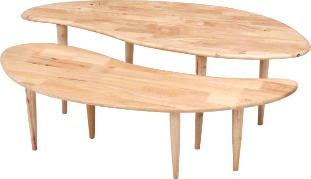 天然木ならではのナチュラルマークのある商品です。 色目の濃淡や湾曲など、天然木の素材を活かした商品で1点1点表情が異なりますが、不良ではありません。 1つのテーブルとしても2つのテーブルとしても使用できます。 重ねて収納ができ、使わないときも場所をとりません。 全体的に丸みを帯びた形状で、お子様のいるご家庭でも安心です。 あたたかみのある天然木でお部屋を優しい雰囲気に演出します。 ナチュラルな