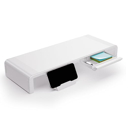 【安定性優れ】金属プレートが内蔵されているため、重厚感を増して耐荷重が50kgほどにもなり、モニターだけでなく、ノートパソコン、テレビ、プリンターなどもぐらつきなく載せられます。*引き出しやスマホスタンドがスムーズに開け閉めできるように、25kg以下のものをその上に置くことをおすすめします。