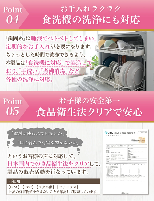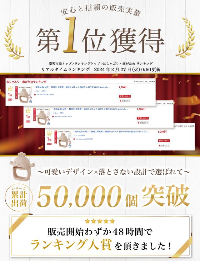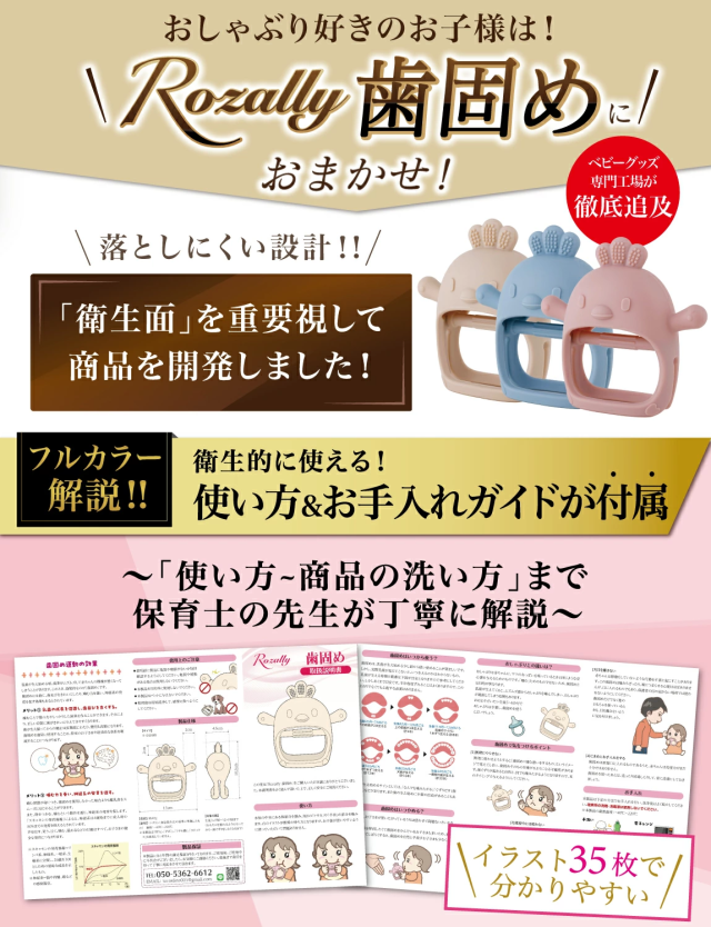 | 本製品には 子供 の 歯固め を円滑にサポートできるよう、商品の使用方法 はもちろん 衛生的に使えるお手入れ方法 など丁寧に使用方法を解説させて頂きました。 |