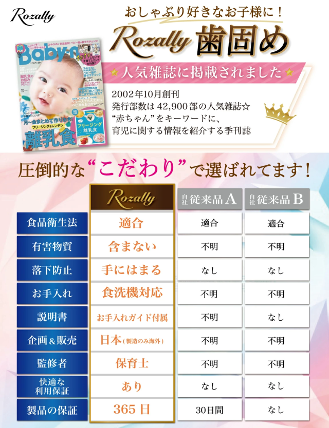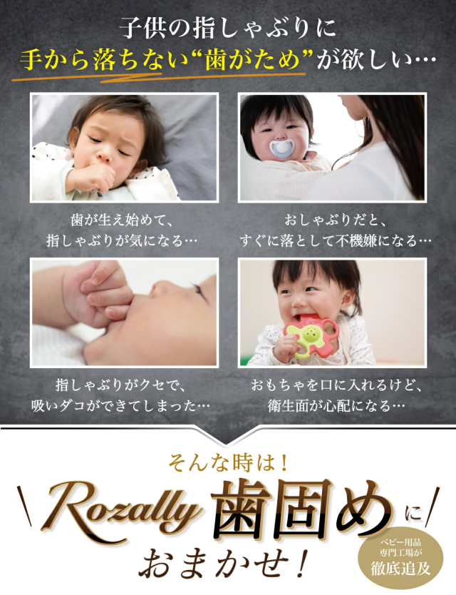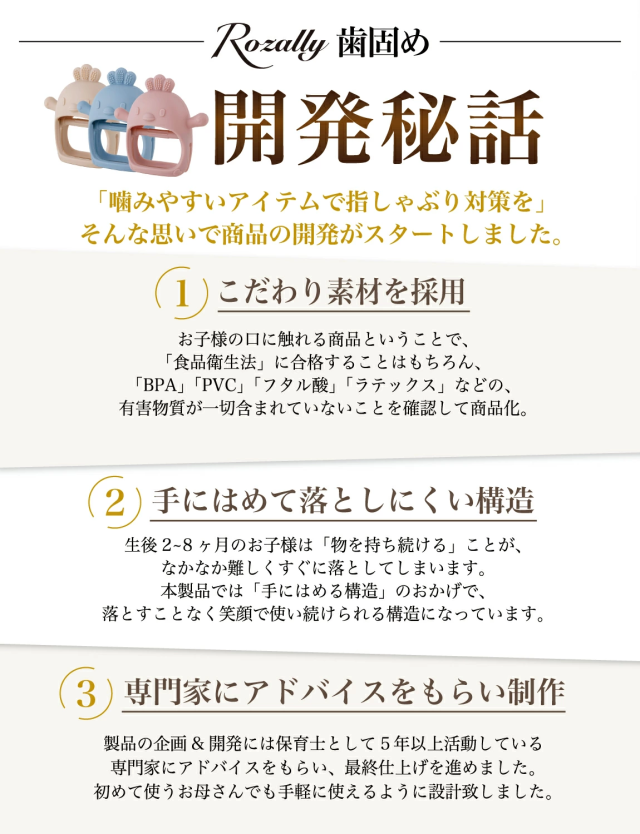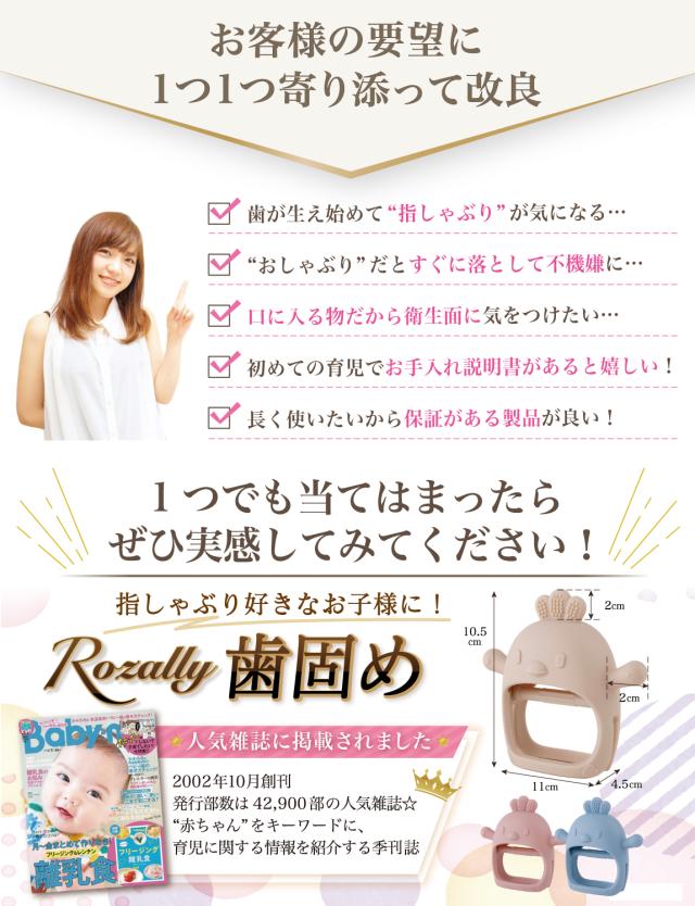 | 様々なメーカーから 赤ちゃん用 や ベビー用 の育児グッズとして” 歯固め ”が販売されていますが、Rozallyの 歯がため は”こだわり”が一味違います。