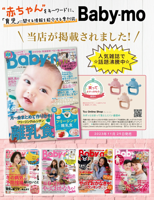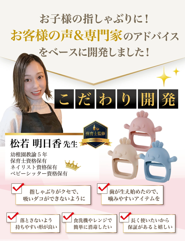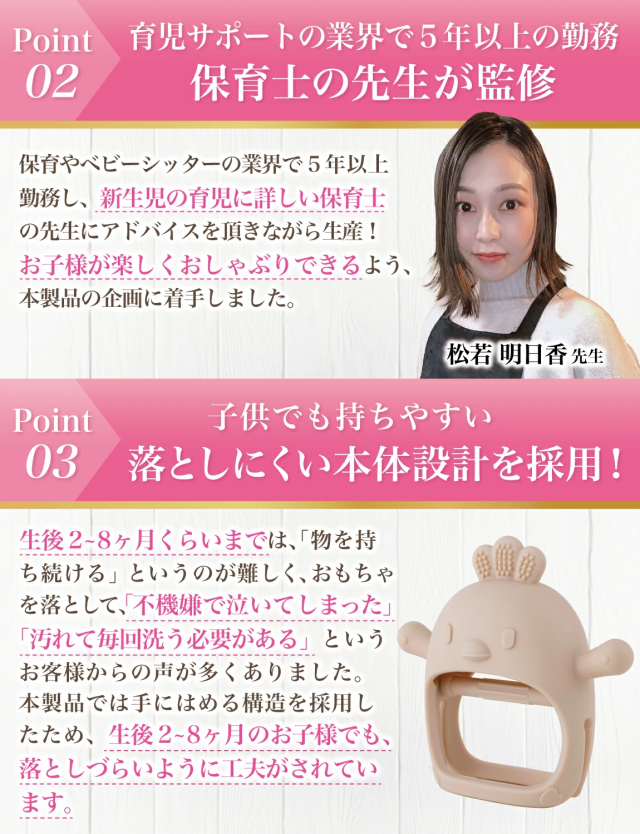 0歳 の 赤ちゃん が 生まれてから 2ヶ月3ヶ月 で迎え 1歳 くらいまで続く” 指しゃぶり “の時期に活躍する 歯固め です。 新生児 は 乳歯 の生え始めの時期に口内がムズムズするため、指 を こまめに カミカミ することでムズムズ感を解消しようとします。 はがため は 赤ちゃん の ファーストトイ の おしゃぶり としてプレゼントに用いられることも多く、出産祝い や ギフト にも 人気 の 可愛い おもちゃ になっています。 弊社の 歯がため は使用素材の”シリコン”にこだわり、食品グレード なことはもちろん「食品衛生法」の検査を受け、BPAフリーであることも確認して、 安心 & 安全 にこだわって販売を開始しています。 企画&設計では 新生児 や ベビー の育児に詳しい【保育士】の先生からアドバイスをもらい、 はがため の仕方 や お手入れ方法 など色々な使用方法を説明書として添えて企画&開発しました。 |