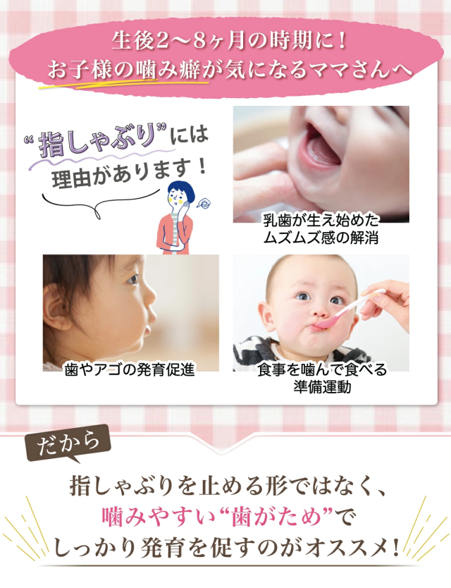 0歳 の 赤ちゃん が 生まれてから 2ヶ月3ヶ月 で迎え 1歳 くらいまで続く” 指しゃぶり “の時期に活躍する 歯固め です。