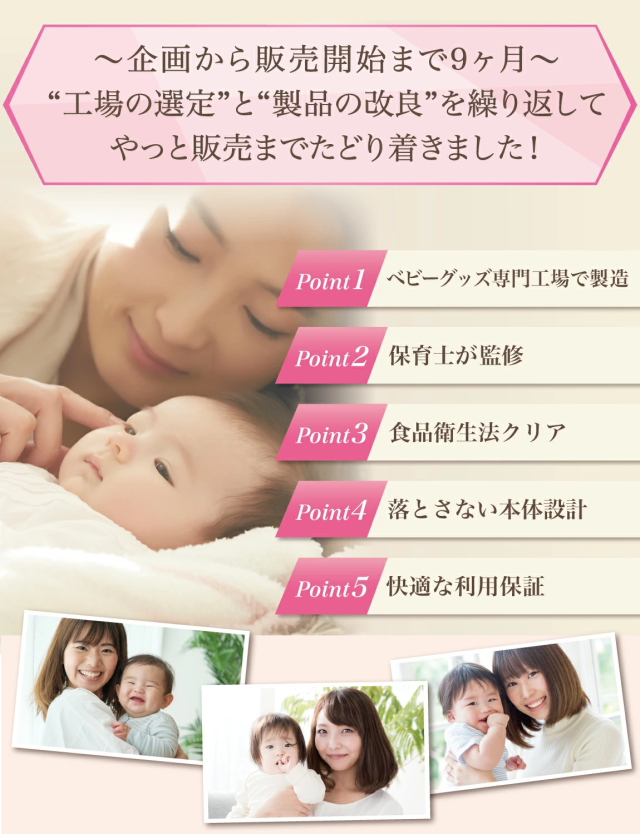 おしゃぶり や 指しゃぶり対策 の関連製品 をメインに取り扱っている10社以上の工場からサンプルを取り寄せ、「落とさない設計×かわいいデザイン」を一緒に試行錯誤して頂けた1社に絞って発注を行なっています。 製造カラーについても 男の子 女の子 のお好みに合うよう3カラーにて展開をさせて頂きました。 |